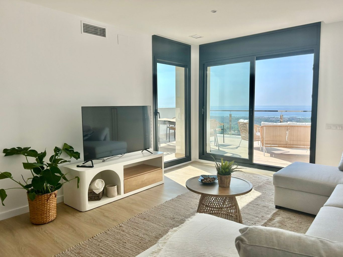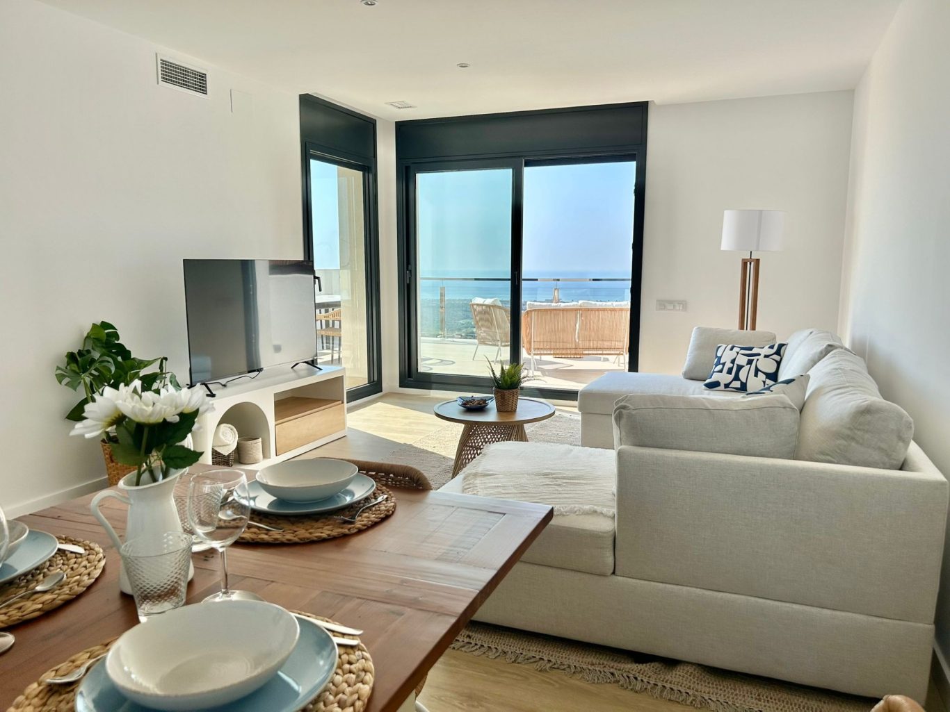 En el nivel intermedio se encuentra la zona de día, con una cocina totalmente equipada, un acogedor salón con Smart TV y un amplio comedor preparado para 8 a 10 personas. Todo pensado para compartir momentos en familia o con amigos en un ambiente de lujo y comodidad.