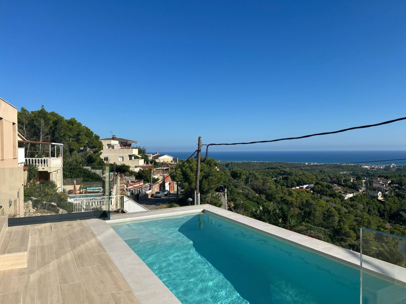 En la planta baja, la villa cuenta con una piscina privada con vistas panorámicas, accesible directamente desde dos de las habitaciones.