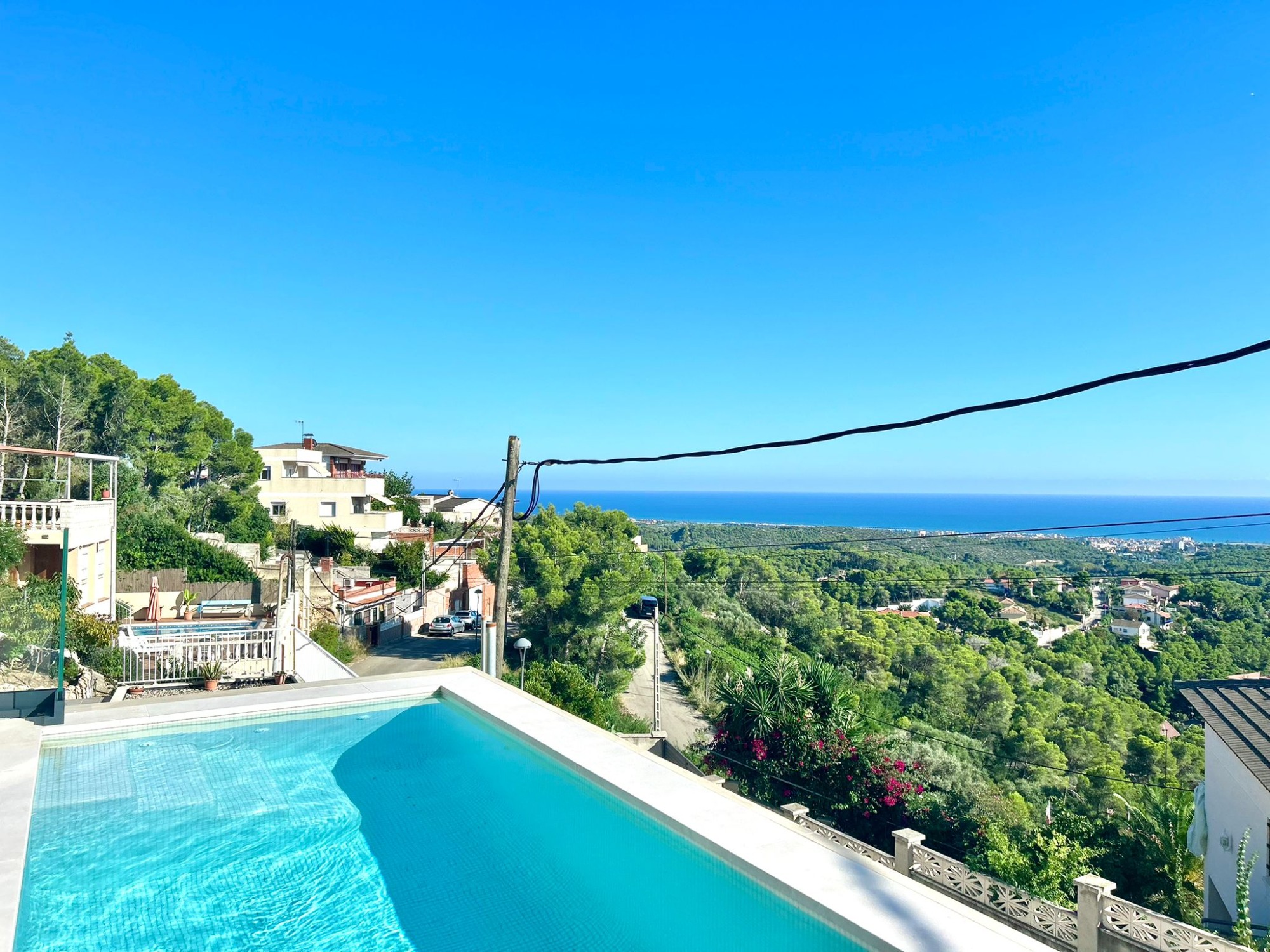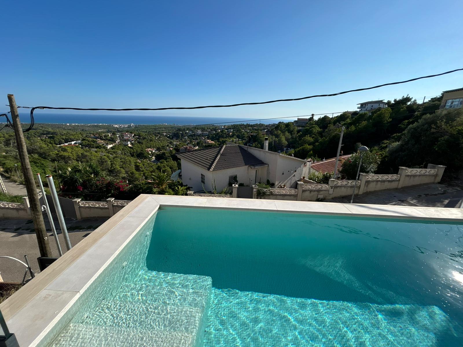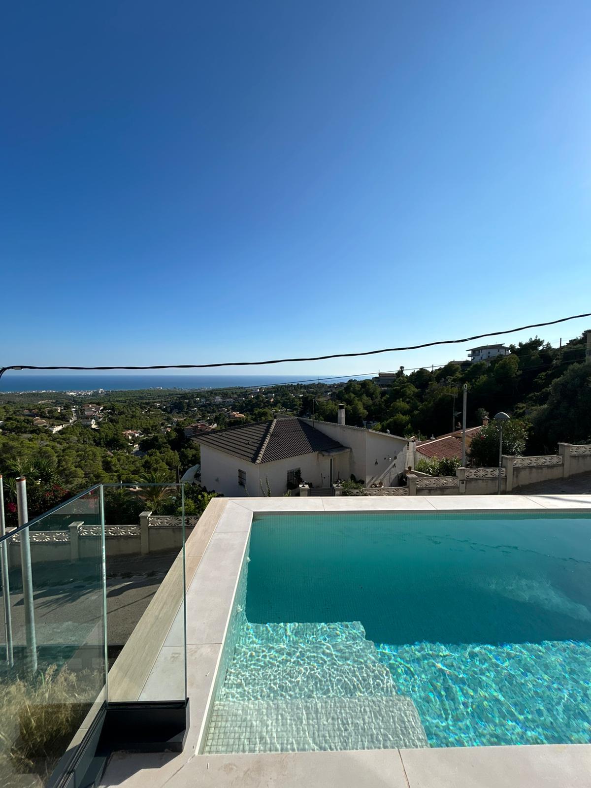 En la planta baja, la villa cuenta con una piscina privada con vistas panorámicas, accesible directamente desde dos de las habitaciones.